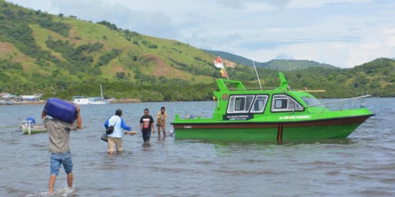 Speed boat dari Balai Besar Konservasi SDA Kupang di Taman Wisata Alam 17 Pulau Riung, Kecamatan Riung, Kabupaten Ngada, Pulau Flores, Nusa Tenggara Timur.